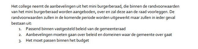 Op dit moment berekende CE-Delft dat het huidige beleid kan uitkomen tussen de 7 en 54%. Deze onzekerheidsmarge is te groot voor dit groene college. Het mini-burgerberaad moet voor de verkiezingen in 2022 met adviezen komen zodat deze betrokken kunnen worden bij de campagnes. Er zijn wel restricties. Zo mag het vastgestelde beleid niet ter discussie worden gesteld, terwijl dat beleid wellicht de reden is dat burgers de gemeente te hulp moeten schieten.