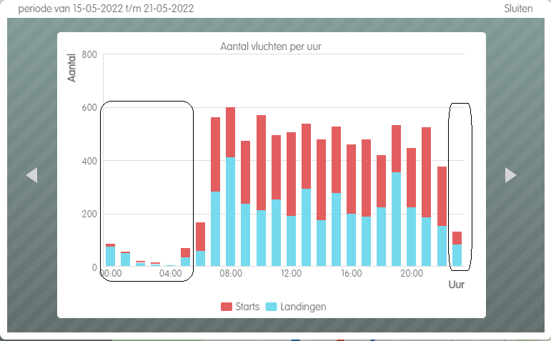 Schiphol is officieel tussen 23:00 en 06:00 gesloten. Maar veelal starten en landen er dan nog vliegtuigen. Het vliegverkeer begint vanaf 05:00.