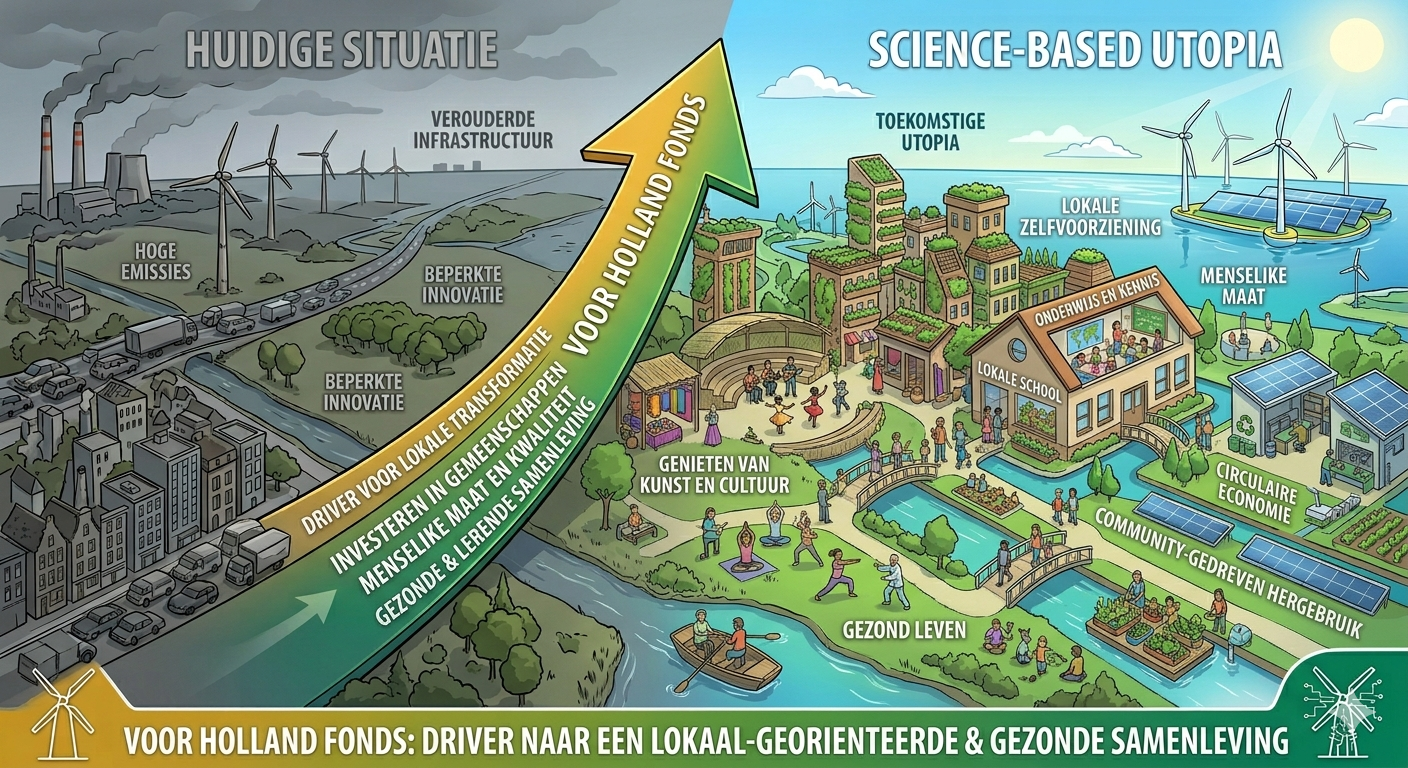 In een tijdperk dat wordt gekenmerkt door de polycrisis—een vlechtwerk van ecologische instabiliteit, groeiende ongelijkheid en financiële kwetsbaarheid—fungeert het Voor Holland Fonds als de strategische katalysator. Het is de driver die de huidige, extractieve realiteit omvormt tot een Science-Based Utopia. Dit is geen abstract droombeeld, maar een rationaal ontworpen samenleving waarin wetenschap de menselijke maat dient en economische kaders worden gedicteerd door ecologische grenzen en monetaire rechtvaardigheid.